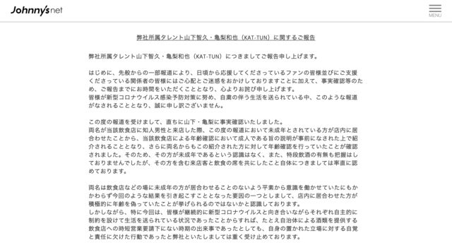 「この件で生じた問題点は主に2つ。ひとつは、例の未成年女性とのホテル密会の説明がないまま逃げるように退所した点と、退所後となる翌11月以降の有料ファンクラブの更新手続きを促していた点。後者は今後なんらかの対処が取られると思われますが、前者はこのまま真相が明かされることはなく、モヤモヤした気持ちだけが残ることでしょう」(芸能ライター)